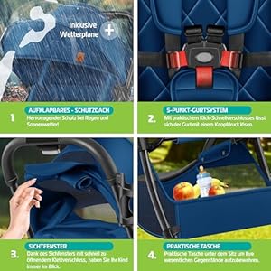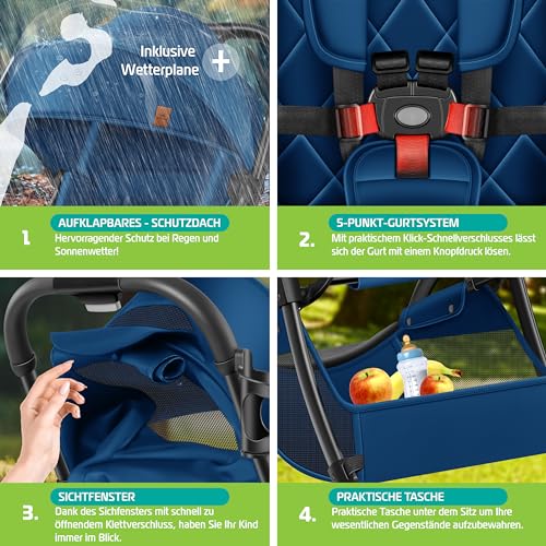 KIDIZ-Kinderwagen-Premium-Kinderbuggy-klappbar-Liegebuggy-Sportwagen-Faltbar-360Raeder-5-Punkt-Gurt-Inkl-Getraenkehalter-Regenabdeckung-verstellbare-Rueckenlehne-Sonnenverdeck-Navyblau