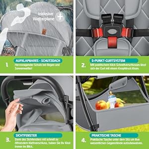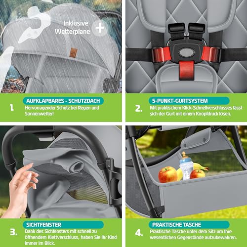 KIDIZ-Kinderwagen-Premium-Kinderbuggy-klappbar-Liegebuggy-Sportwagen-Faltbar-360Raeder-5-Punkt-Gurt-Inkl-Getraenkehalter-Regenabdeckung-verstellbare-Rueckenlehne-Sonnenverdeck-Grau